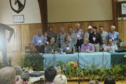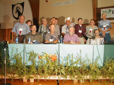 | Ed Patrick, fourth from top left, at the 2003 Willow Creek INTERNATIONAL BIGFOOT SYMPOSIUM, with other notables. Photo by Steven Streufert, copyright 2003. |