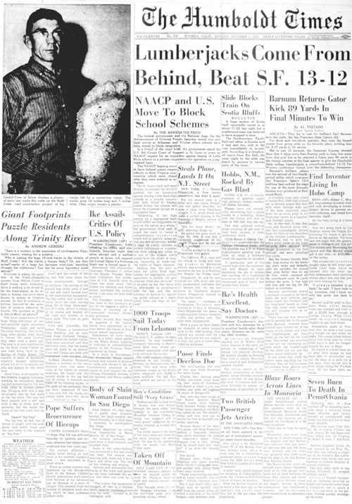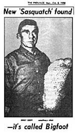 | Jerry Crew with footprint from Bluff Creek in the 1958 article that gave "Bigfoot" a household name and birthed Bigfooting as a culture in North America. |