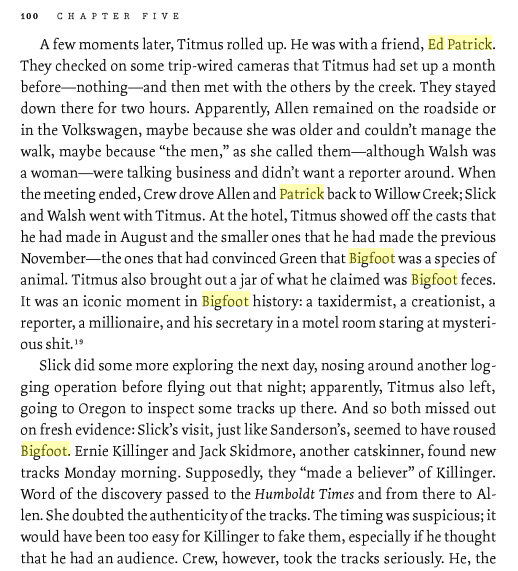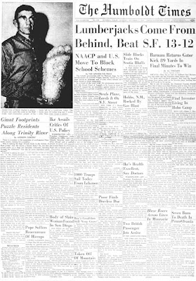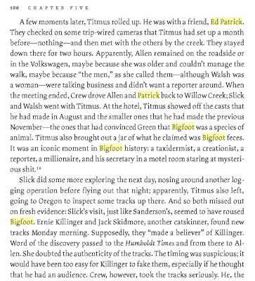 Briefly, Ed Patrick was one of the vital links in the chain of early Bigfooting. He may have been the main connection between Jerry Crew, the catskinner road contracter cutting logging tracks in 1958 up in Bluff Creek, and Bob Titmus, the taxidermist and hunting guide who taught Crew about using plaster to cast some of the many Bigfoot tracks found during that time. Of course, it all went down in the history of Bigfooting, as Crew's cast appeared in the Humboldt Times as the cover story that early October. Ed was subsequently one of the few first members of the PACIFIC NORTHWEST EXPEDITION, organized by Tom Slick, entrepreneur, innovator airman and oil magnate. Along for the ride, at least for the first nine days was Rene Dahinden. John Green left the project shortly thereafter due to personal conflicts and arguments about such subjects as Titmus hanging up used tampons that he'd fished out of service station rest rooms in trees around the area of Louse Camp. However, Ed Patrick remained steadfastly on duty up in Bluff Creek even after Bob Titmus had to return to his taxidermy business in Anderson, near Redding, CA, and Peter Byrne arrived from the Himalayas to take over the operation. Patrick was a local of Redding but also of Hoopa and Willow Creek, in the heart of the Northern Californian classic Bigfoot Country.