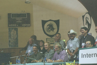 | One of the organizers, whose name we've forgotten (he assisted Al Hodgson), announces the historical notables discussion. John Green, Jim McClarin, two area locals, Bob Gimlin and Hodgson, from left. |