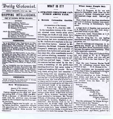 Not many newspaper articles of long ago mentioned Bigfoot. “But one news article took on an almost legendary status. The story of Jacko--that of a small ape like, young Sasquatch said to have been captured alive in the 1800s--is a piece of folklore that refuses to die, despite a superb investigative article published in 1975, coauthored by John Green and Sabina” (41). Supposedly, in the 1800s a live Bigfoot was caught near Yale, British Columbia. This Bigfoot was housed in a local jail. People had been interviewed, but none of them said that they had seen the beast. One man said his parents didn't let him visit the jail even though he wanted to see Jacko.