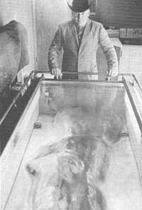 In August of 2008, two Bigfoot hunters said that they had legitimate evidence that Bigfoot exists: they say they have photos of a dead specimen and DNA evidence that they found in Georgia. They were to present it in Palo Alto, California. The Bigfoot hunters, Matthew Whitton and Rick Dyer, were really scared when they first saw the creature. Dyer, who also runs a business Bigfoot Tours, said that there was more than one Sasquatch. They said that they had seen three more beasts as they were dragging the dead Bigfoot through the woods. “Moreover, Mr. Dyer says he has video clips and photographs to prove it. One photograph provided to the news media showed what resembled a gorilla — or maybe an old sheepskin rug — lying twisted in a freezer, with a dollop of intestines protruding from its belly” (McKinley A12). Tom Biscardi is a Bigfoot booster and also has a Bigfoot website, sells Bigfoot merchandise, and runs a radio station on Bigfoot says that he believes it is real. In fact, he says that it is 150 percent sure that it is real. “Both Mr. Biscardi and Mr. Dyer said they expected skeptics to discount the find, which is being kept in a freezer in an undisclosed location outside Atlanta. But they promised even more proof, including video, a DNA test and, of course, a mission to capture one of the big guys. 'I'm not asking anyone to believe us,' Mr. Dyer said. 'I'm just asking them to sit and watch, because you're going to eat your words” (qtd. in McKinley A12)(A12).