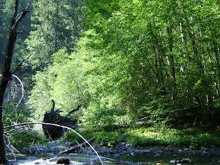 Images: Al's framed Peter Byrne photo featuring Mike Hodgson on the film site; middle, from I.C.'s GPS unit, the Bluff Creek headwaters; below, the film site seen from upstream of the "big bend." Photos, first and last: by Steven Streufert.