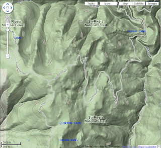 Image: Terrain map containing the Onion Mountain to Blue Creek Mountain area, down to Louse Camp.