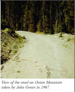Images: Blue Creek Mountain track, above; John Green's book; a photo taken by Green on Onion Mountain, from the trackway find that preceded the one on BCM by a few days (Onion Mountain is on the same road, right next to BCM).