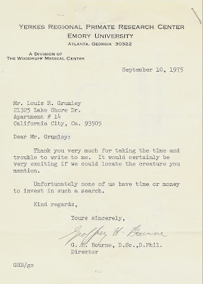 Image above, Click to Enlarge: A letter to Rich Grumley, California BigFoot Organization (CBFO) from Dr. Geoffrey Bourne of the Yerkes Regional Primate Research Center.