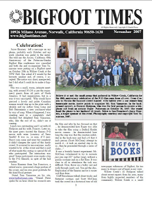 Image above: The Bigfoot Times issue featuring the 2007 PGF Anniversary Celebration, with the Bigfoot Books shop in Willow Creek on the cover. CLICK IMAGES TO ENLARGE AND READ. Click the colored links to explore further.