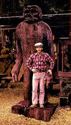 Image below: Daniel Perez in 1985, with his hunting trophy, the Legend of Bigfoot statue outside of Benbow, CA.