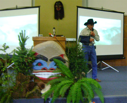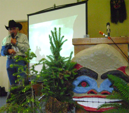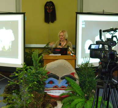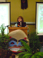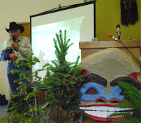 Some Natives believe Sasquatch have always been here, or were created here, and did not come across a land bridge. She spoke of wars between the Bigfoot people and the Native tribes. There was trade between the groups (shall we say species?), sometimes in face to face meetings, other times involving items left in the woods which were replaced with a trade item. Salt, woven mats, and such were desired by the Bigfoot people. Sometimes the Bigfoot would try to cheat the humans in face to face trading. There was a ceremonial process that allowed a human to become a Bigfoot clan member, and there are accounts of offsping being produced, though sometimes "mentally slow" individuals were the result. From here she spoke some on Native American culture and told some stories. One account of a Bigfoot cave that was surrounded by bones of his human victims was particularly intriguing. She presented images of archaeological and cultural pieces from Native American "Hairy Man" traditions, and declared that these indicate that the Bigfoot motif was NOT introduced by European invaders. There are no "Christ-like" motifs present in these cultural pieces that were obviously introduced by Europeans, suggesting that these were original, non-introduced aspects.