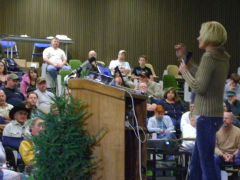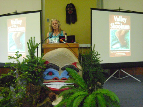 Next up was another presenter with a tale of a Bigfoot habituation scenario. Coincidence? No. This was Autumn Williams' mother, SALI SHEPPARD-WOLFORD. The habituation of Skookums around the small cluster of rural cabins along the Carbon River at Orting, WA, is the basis for Williams' nearly life-long involvement in the field of Bigfooting. Autumn was just a three-or-so-year-old when she and her mother saw two of these big, hairy whatever-they-ares standing as clear as day before them along the trail from their home. Her mother is the author of the book, VALLEY OF THE SKOOKUM: FOUR YEARS OF ENCOUNTERS WITH BIGFOOT, a fine and engaging read. The book contains many elements that will raise a skeptical eyebrow, or two; but it is not just the story of encounters with Sasquatch, but also of one woman's shamanic and spiritual process. The accounts in the book are verifiable in that many a neighbor, a non-believing father, some Bigfoot researchers, and a young child all saw them, and their footprints and other remains and signs.