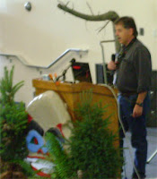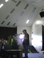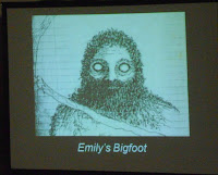 After that, in an exhausting afternoon time slot that he had complained of the night before, THOM POWELL gave his great talk before a surprisingly (to him?) still-packed house. Powell is a witty, sometimes sardonic fellow, used to entertaining students at a middle school level, so it translates well into his public speaking. He had a slick graphic slideshow running on his computer, but it didn't feel like he was just rattling it off; until the end, that is, as he accelerated as if aware that some in the audience might be wearing thin with this exhaustingly long schedule. Powell admits that Bigfoot researchers are amateur scientists, even one such as he who is a Science teacher. But that shouldn't discourage us, he says. After all, the Wright brothers were amateurs. From viewing Bigfoot as an example of "junk science" in his classes, at some point he could not deny the possibility that this phenomenon was actually real. This is because he actually LOOKED at the evidence, whereas so many "real" scientists do not.