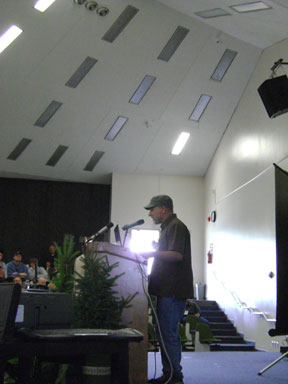 After a long saga of a drive the day before, and an eventful evening at the OSS Meet-and-Greet, followed by some high times at the karaoke bar and a lively room party at the Red Lion Inn with fellow Squatchers (see our previous report HERE), we weren't exactly in tip-top shape the morning after, after having had only a few brief hours of actual "sleep." A quickly gulped down-breakfast and triple dose of coffee, and we were on the road to Lane Community College for the first of these Eugene, Oregon Sasquatch Symposia.