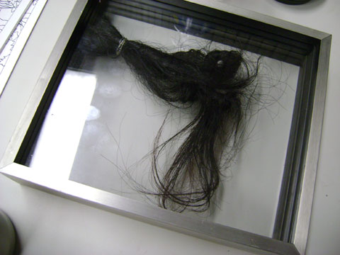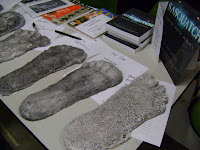 Sali's talk was basically readings from the book. She covered the Bigfoot parts, and didn't focus on the Native American spirituality and the dancing lights in the sky. The accounts are plausible, and well told, evoking the mystery of the experience of repeated encounters, and growing habituation. Of course, we cannot "verify" spiritual or subjective experience, so hey, just let it be. The Bigfoot events in the book, as well as the dancing lights, were witnessed by many different people living out there, and so are verifiable to that degree. She later told us that the other stuff happened "in dreams," and hence it was her own private spiritual or shamanic experience, and was parallel to but not necessarily related to the Bigfoot stuff. Her presentation table, beside Autumn, contained horse mane hair (seen below) that was found woven in interesting ways, and may have been done by a Bigfoot.