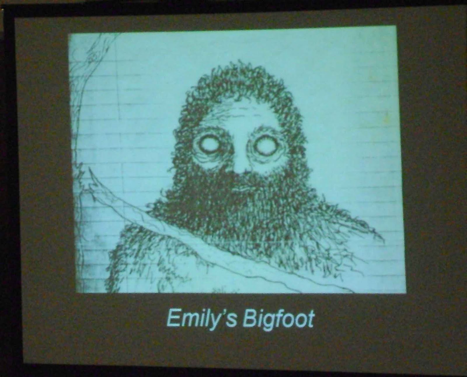 Thom is a rational fellow, an adherent of the Occam's Razor approach of Parsimony. Starting out using Sasquatch as a lesson plan aimed at using critical thinking to debunk Bigfoot evidence and belief, and going out on field trips to investigate, Powell found himself slipping to the "believer" side of the issue (where he firmly sits today). For a guy who obviously loves sarcasm, we often wonder if he'd rather be on the skeptics' side, just for the fun of it. But we're glad to have him on our team. Speaking of Bigfoot he said, "While you are out studying them, they are studying you." Speaking of researchers he says, "The only way we're going to get anywhere is by sharing." It is a terrible thing not to share information, though one might want to keep exact locations of sightings and one's field work secret. But beware, "Studying Sasquatch is not good for your personal life." He claimed to have been divorced like 11 times, but that must have been a joke. He offered a bunch of advice how to temper this detrimental effect by using levity and balance. "I don't search for Bigfoot anymore..." he said, and in response to a hypothetical question, "First of all, I don't look for Bigfoot. I let Bigfoot come to me...." In high school, "As soon as I stopped chasing girls, they would come to me!"