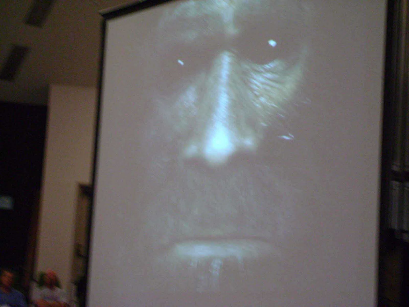 The story has been told so often there isn't all that much more he can add to it, though. Here he clarified one issue: whether the creature in the film was squatting or standing when they first saw it. Bob had said standing, whereas Roger had said it was squatting. Gimlin explained that Roger had been ahead of him about 12 feet on the path up the creek, and that therefore the first man saw the creature first, and Gimlin didn't glimpse it until a second later as it was standing erect. We know, this is stuff for only the most avid PGF nerd; but it held the audience's attention captive for his brief but intense talk.