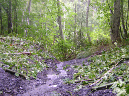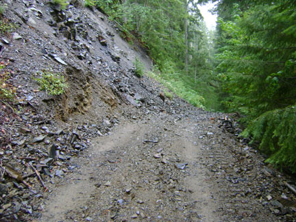 One bit of good news (temporary, see latest developments in State Two) was the plowing through done on the infamous rock slide. This slide has notoriously been the bane of PGF site visitors, especially those without high-clearance four-wheel drive vehicles. Last summer this was the spot of the near-death experience of Craig Woolheater and Sharon Lee (see our previous posts on the Believe-It Tour visit), as their rental van got stuck spinning its wheels after a photo-op and nearly slid off the side into the precipitous near-vertical drop down to the creek.