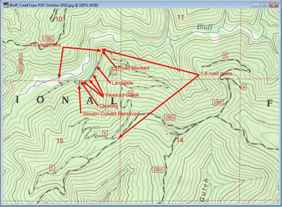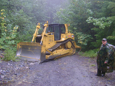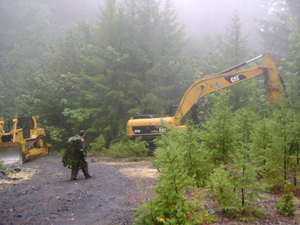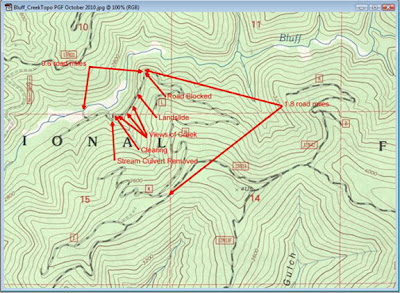 For those planning a journey of their own to the Bluff Creek Film Site be advised that the last mile or so of 12N13H has been permanently been put to bed. On the weekend of 09-18-2010 the road was freshly graded and the heavy equipment lay parked about. By the weekend of 10-09-2010, the heavy equipment was gone and the road had a new ending. With about a mile to the bottom, a enormous new earthen berm was there to greet us. The rest of what use to be the road had been out sloped, portions covered with trimmed vegetation to help protect the exposed soil from erosion, culverts were removed and the creeks reestablished back into their own channels. Give yourself more time for exploration. Avoid wet weather, the fresh graded soil turns quickly into mud. Be prepared to put in a little more effort to reach the film site. Think of it as a way of reconnecting.  Reaching the bottom will feel that much more rewarding … it’s the hike out that’s going to suck! ---Robert Leiterman