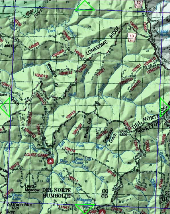 Lonesome Ridge, Bluff Creek, centered near the PGF site.