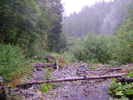 Down under the bridge we could clearly see the old ford's road cuts on either side of the creek, with an old roadbed heading up the east side of the creek, then fording across up a little bit to the west side. Already we knew that the road was just as we suspected: a winding logging access-4WD track that crossed the creek where needed, not the clean road cut up all the way on the east creek side as has been commonly assumed. The bed of the creek is just not wide enough to accommodate the latter, and it often cuts up against steep, hard rock faces. It is shallow enough most of the year, though, to allow for a multitude of needed fords. Again, as Al Hodgson had told us, the old dirt and gravel road had been washed out in the massive 1964 flood, and had then been re-plowed upstream to allow for salvage logging in 1965 and 1966. Despite all of these years gone by, we could still see remnant signs of this road cut, as well as many sawed off tree stumps and root-balls in the creek's course. Since 1964 there has not been a comparable flood to alter the major features cut out by the one in 1964, which also constructed the famous PGF sandbar upstream. We noted these results, and planned to investigate up the creek once we had returned from our drive up to the PGF site. Our plan to hike up there this day had been dampened by the rain, now again lightly drizzling down. It was clear to us, however, even at this early point, that we were on the right track to finding the Patterson-Gimlin 1967 base camp. In our Stage Two trip we discovered what is almost certainly the right site. More on that next time, though.
