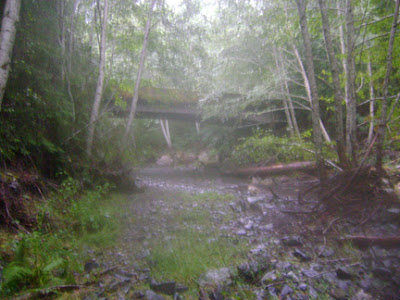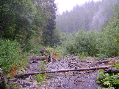 After the creek one descends down to the old landing where the "bat boxes" are. This used to be the easy park-and-camp option for PGF site pilgrims--no longer, unless you pack it in. This is where Peter Byrne said to look in my recent email correspondence with him (see Appendix B below for full discourse). The rain increased, saturating us and our gear. You'll note a fogginess enters the photographs here as my camera got wet. Darnit, so did my tobacco. Anyway, here at the bottom we were at our first on our list of prospective film site locations--and it really seemed almost too convenient, here where one could once just get out of the car and gaze at Bigfooting Mecca.