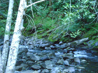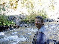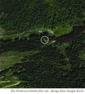 We were lucky to get up there without being trapped by the kind of meteorological attack from the skies that nearly stranded Patterson and Gimlin back in 1967. The rain became light and sporadic throughout the night. The next day was another matter. Leiterman had just returned from a long, exploratory hike up the creek to the film site area and back. We heard his tales of adventure over a sputtering camp fire. He told of having found the M.K. Davis-identified "film site," downstream some 500 yards from the "bat boxes" landing where nearly all others agree is the real area of the site. He said he found the site implausible on a number of counts, based upon our previous discussions. This aspect will be discussed more thoroughly in State Two of this blog's presentation. Suffice it to say, the MK site is way too wide to fit what is known about the P-G site, and the trees were too far back to be acceptable as the ones in the film.