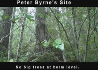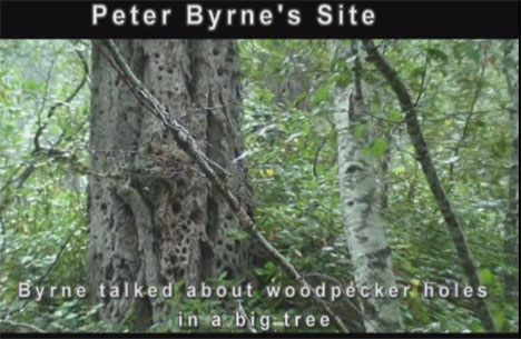 We found the tree described obviously by Byrne, pockmarked somewhat unusually with woodpecker holes, but it was at most 100 feet, not 100 yards across: too close; and the stumps he described are right next to it, not at the greater distance measured by Dahinden.  To reach up to the larger trees on the hill above the creek and sandbar would have had to have been some 30 or 40 feet higher--just not plausible, and exceeding the already high level of subsidence mentioned by Byrne in his email. The creek is in an old, established bed, at the lowest point of flow, and there is no indication of any major event that could have changed this geological fact.