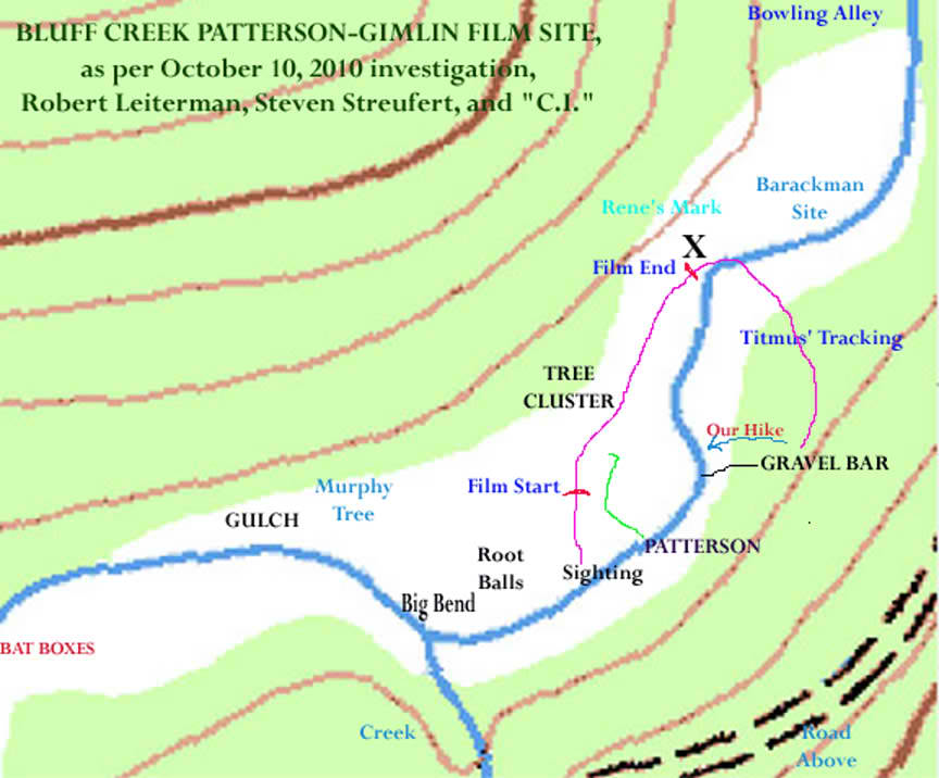 In the three years following that conference, we've spent an inordinate amount of time trying to ascertain the history not only of Patterson and Gimlin's time spent in the area, but also the Bigfooting, logging and road-building history of the area. Much of this history seems to be lost to time. Other aspects of it seem vague or contradictory in the memories of many locals who worked up there and many Bigfooters who had been there over the time since the late 1950s when the area became famous for its hairy-hominoidal activities. Though stories were recalled, the exact locations of those events seemed either lost or poorly recalled. This a fact of human memory. So concerned were all involved with viewing the creature in the film, that many neglected to remember the site itself. It was once known well, and was visited and documented regularly by Rene Dahinden, the Swiss-Canadian who perhaps knew the film and its history best. But with the passing of Rene we were left with stories, old photos, an arrow on a topo map in Daniel Perez' Bigfoot at Bluff Creek, but apparently no one who could walk to the site and with absolute confidence put their foot down where Patty had walked. However, many claimed to know, without proof. We are lucky that Dahinden marked the map for Perez, and that Daniel was assiduous enough to preserve and publish it, or we might have lost the site forever.