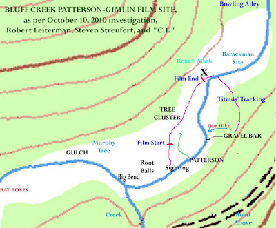 Perhaps a little personal research history is in order here, briefly. Sometime around the year 2001 we first went camping up in the Bluff Creek basin. Being there at historic Louse Camp brought back the old childhood memories of reading the Bigfoot books at the public library, of having seen the P-G Film sometime around age 10 or 11, and being fascinated with the possibility of such a creature existing. At the time of that trip we had in our possession John Green's On the Track of Sasquatch, and we vaguely decided to try to find the site of the film. Well, it wasn't easy. After trying to hike up the creek we made it maybe a mile and a half, but found only one promising sandbar that didn't seem to come close enough to the mark on Green's map. It was all rather vague, as that mark was on a map without a scale close-up enough to see real detail. We prowled the old, now-closed forest roads along the west side of the creek. We tried hiking down to the creek, only to find ourselves stuck at huge log piles and near-vertical cliffs. We didn't make it up there after the 2003 Willow Creek International Bigfoot Symposium; but then we were a bit glad we didn't pay the $75.00 to go. The group had gotten there, with luminaries such as Green, Bob Gimlin, Al Hodgson, Daniel Perez, Christopher Murphy, Matt Moneymaker, Autumn Williams, Jim McClarin, and many more; and still they could not all agree on where the site of the exact track-way was. This problematic situation was documented in the Doug Hajicek TV show, Mysterious Encounters.The site had changed so much that those who had been there back in the day could hardly even recognize the general area, let alone the actual site of the sighting and film. We are told that even  Bob Gimlin, who was there that day of October 20th, 1967, could not recognize the place at first, and was taking cues from Perez as to its location.