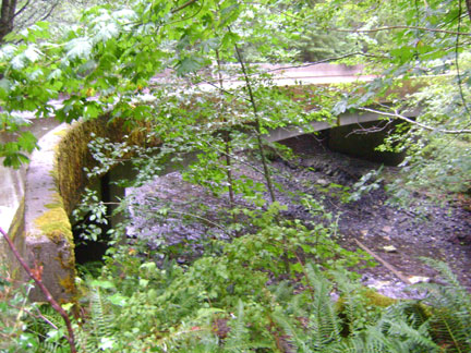 Under Bluff Creek Bridge, showing old road cut and ford to opposite side.