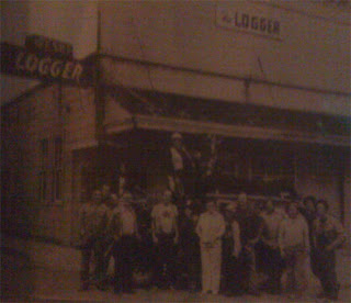 Here one may see the LOGGER BAR in Blue Lake, in an undated photo that appears to be from the 1960s. The thing on the platform around which the men are gathered is a BIGFOOT CORPSE, supposedly shot up in the hills east of town. One may find this historical photo among many others documenting the logging heyday of Humboldt by looking in the hallway right before the restroom doors. In the admittedly "blobsquatchy" enlargement (click it to view even larger), one may find the "creature's" head to the right side, with its hand dangling out further.