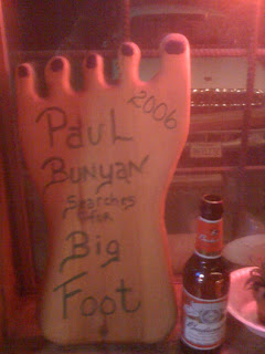 Simon's bar also has a relic of the days around 2005-06 when a quite tall man calling himself "Paul Bunyan," from somewhere around Redding or Anderson, had planned to lead a Bigfoot Outdoor Camp and expedition training in our area. He came here, carved a lot of wooden footprint stompers, chopped some trees, and then disappeared.