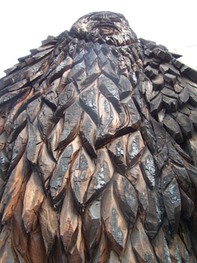 Images: The Al Hodgson-gifted Bigfoot statue, on the back porch at Bigfoot Books, Willow Creek. Photos, Steven Streufert. CLICK ALL IMAGES TO VIEW ENLARGED FOR DETAIL.