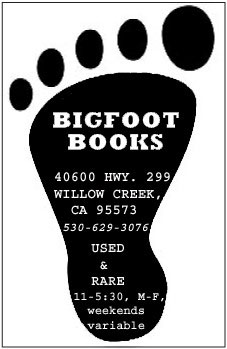 Drive east from downtown Willow Creek about one and a half miles and you will come to our own shop, BIGFOOT BOOKS, which of course has many Bigfoot books (over 100 titles for sale at this point) and knick-knacks, as well as yours truly sitting at the desk probably blogging and internet bigfooting rather than actually getting any work done on the books. Besides Bigfoot, we have a full building stuffed to the rafters with used books in all subject areas.