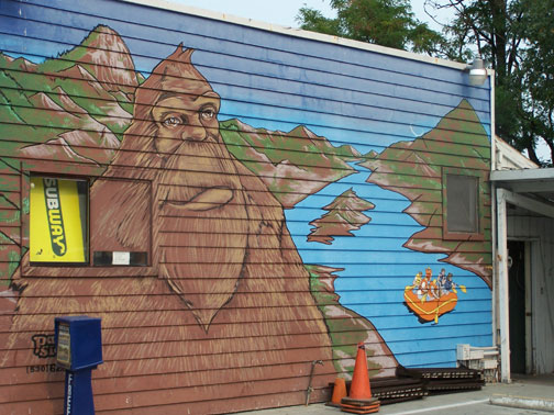 Just across the street from Cinnabar's you'll see a large full-wall BIGFOOT MURAL on the ACE HARDWARE building. It is huge. See the long, narrow image in the upper banner of this blog--just click it to see our photo montage of artist DUANE FLATMO's creation.