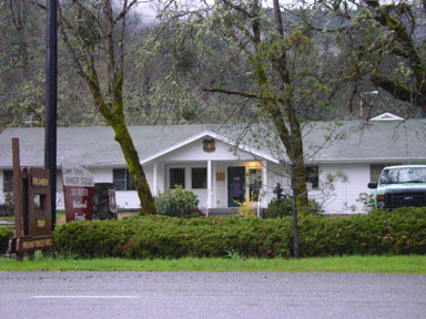 Just next door to our lot one may take repast at THE EARLY BIRD, a basic fast food and take out pizza restaurant, and home to the world famous BIGFOOT BURGER. The sandwich has two patties inside of a foot-shaped bun, and is normally too big for the appetites of the non Bigfoot-sized customer--we heard there is a half a pound of beef used in each one. Inside the big bright yellow building one may view one of the cutest and silliest pieces of Bigfoot art out there in the mural on the back wall: Bigfoot romance, with donuts and coffee roasting over the campfire! They also have a snack market and a nice selection of fishing poles, reels, bait and tackle. The bake-at-home pizzas they make are quite good, too.