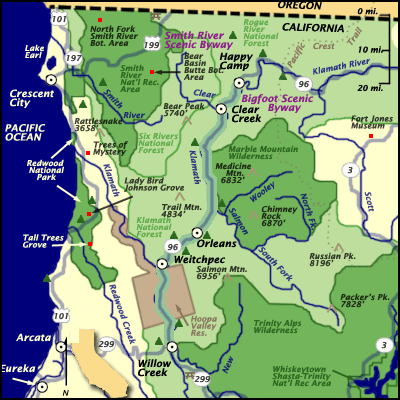 Click the link here for an interactive MAP OF WILLOW CREEK on Google Maps. The map at left shows the Bigfoot Scenic Byway.