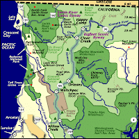 This statue traditionally guards the entrance to Bigfoot Country at the junction of Highway 299 and the BIGFOOT SCENIC BYWAY, Highway 96, which leads up through Hoopa into the Bluff Creek area (see MAP below). Drive the highway north until you get to Happy Camp, CA, and you'll have traversed the richest zone of Bigfoot history in the world, in our own humble opinion. Stop in Orleans to get into the PGF zone (go up Eyesee Road about 16 miles then turn left on 12N13), or stop at the mouth of Bluff Creek, at the bridge where it flows into the Klamath River for a dip in the water and some great views.
