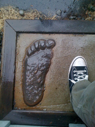 Image to right: The Al Hodgson Bigfoot cast from Bluff and Notice Creeks, in replica, here for size comparison at the foot of the Museum's giant redwood Bigfoot Statue. Photo and foot in Converse shoe by Steven Streufert.