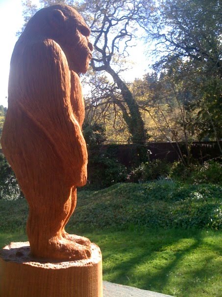 This week AL HODGSON, famous Willow Creek Bigfoot Elder (see our three-part interview with him by clicking his name, above), came in to the BIGFOOT BOOKS shop for a visit. He's always in a bit of a hurry to get back and care for his wife, but he managed to spread more Bigfoot good will. He left us with an absolutely fabulous redwood BIGFOOT SCULPTURE. This was made back in the day by someone in Crescent City, but Al could not recall the guy's name. Apparently they were meant to be put out onto the market, but never made it. Now prominently on display at the shop, our BF stands about 20 inches tall, and is damned proud of it.