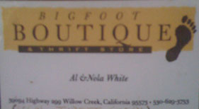 Go farther down the 299 to the east and you'll come to BIGFOOT CONTRACTOR SUPPLY, another hardware store but with a builder's emphasis. They have a small shelf behind the counter of Bigfoot gift goodies, from shot glasses to t-shirts, most of them from the Bishop company line.