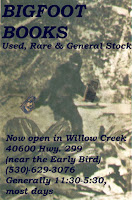 Drive east from downtown Willow Creek about one and a half miles and you will come to our own shop, BIGFOOT BOOKS, which of course has many Bigfoot books (over 100 titles for sale at this point) and knick-knacks, as well as yours truly sitting at the desk probably blogging and internet bigfooting rather than actually getting any work done on the books. Besides Bigfoot, we have a full building stuffed to the rafters with used books in all subject areas.