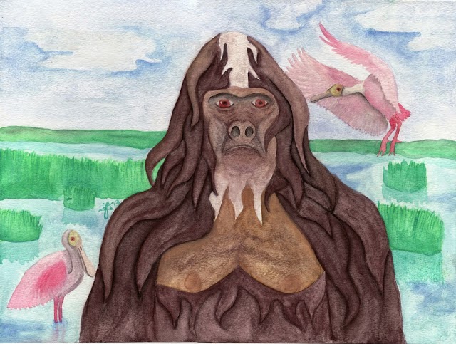 The skunk-like stripe on the creature is also something we find interesting, seeing how the Florida bigfoot is known as the "Skunk Ape". We found some artwork by artist Justin Arnold that bears a striking resemblance to the creature in the photo.