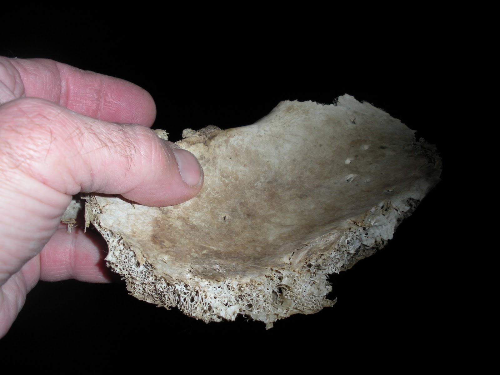 Zap. Less than two days later, there was a message on my answering machine from Allen. He said they found a bone at the base of the 'camera tree'! Once again, I could not believe my ears. I was up at Allen and April's before the next sunset. Allen handed me the bone. It was a saucer shaped bone with ragged edges that seemed too thick to be top of a skull, but it certainly had that the concave shape of a skull. (see photos below.)