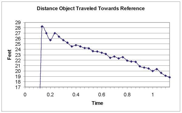 During the period of travel, the object moves a total distance of 9.4 feet at a distance of 225 feet from the filmmaker. The path of the object is nearly perpendicular from the camera’s view as illustrated in the Top View Drawing and also graphed. The position of the object allows it to catch the direct sunlight accounting for the white color. These positions are in disagreement with Claim 7) of the filmmaker for reasons discussed above in section 3) and 7); the camera was also at a zoom of 12%, not 1:1 as stated in Claim 7). The average velocity is therefore 9.4 feet per second or 6.41 miles per hour. The velocity is also graphed, but appears perturbed, due to the short intervals between frames, camera movement, and motion of the individual’s head. These velocity variations seen in the graph do not affect the accuracy of the average velocity, depicted in the graph by a straight red line. Claim 6) of the filmmaker, concerning the object moving 28 feet in 4 steps at a speed nearly unobtainable by humans is completely incorrect. The actual speed, which is also downhill, is a fast walk or slow jog – about a 9 to 9.5 minute mile in jogger’s terminology. The only guess of how the 28 feet was arrived at, may be related to another error made by the filmmaker in calculating the elapsed time since filming: The filmmaker continually states as in Claim 1) that 17.5 months elapsed, but 16.5 is obviously the correct value. The filmmaker also considers the apparent posts in the film to be 9 to 10 feet apart and the object is said to just cross 3 posts. Is he making the same mental error, 3 posts X 10 feet each = 30 feet, instead of the correct answer of 20 feet in this example? Try this, often confusing issue, on a piece of paper to better understand the point being made. However, the apparent posts visible in the video are not 10 feet apart, but more like 5 feet apart to further confuse the issue. This is why a proper reference object was carefully selected in part 5) of the Analysis Details section.