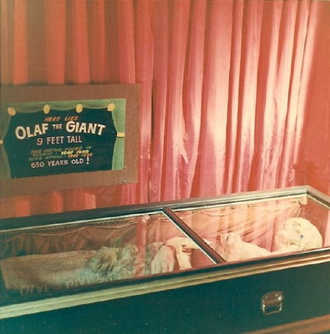 Olaf the Giant had been shown for countless years on the sideshow circuit. His biggest splash came during the Seattle World’s Fair where he was on display as part of Doc (Walt) Jones gregarious collection of bizarre artifacts and gag filled props. Bought by a private collector he was moved to Redmond, Oregon, and was on display at the Fantastic Museum there, until I built my place in Tahoe, where he was moved to be the star attraction.